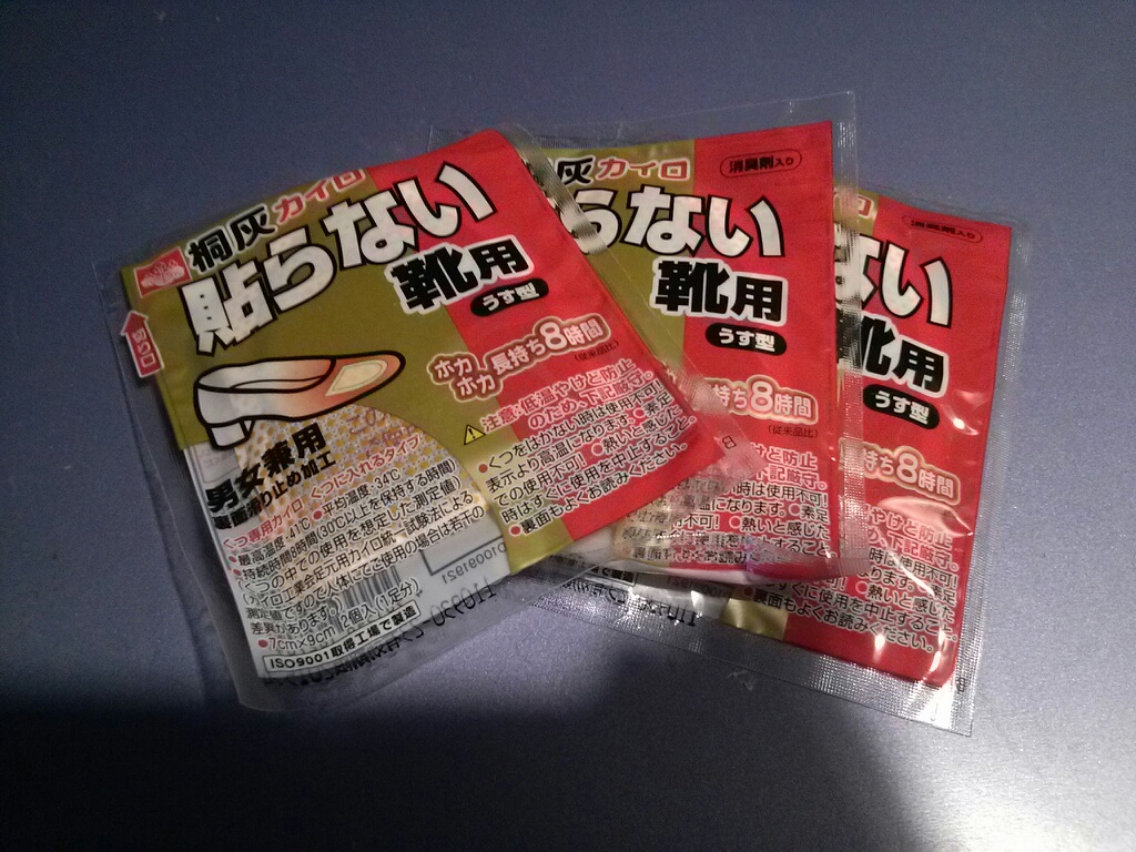おれの場合、手はインナー手袋と冬用グローブを重ねることで十分対策出来たんですが、足先の冷えには参ってました。