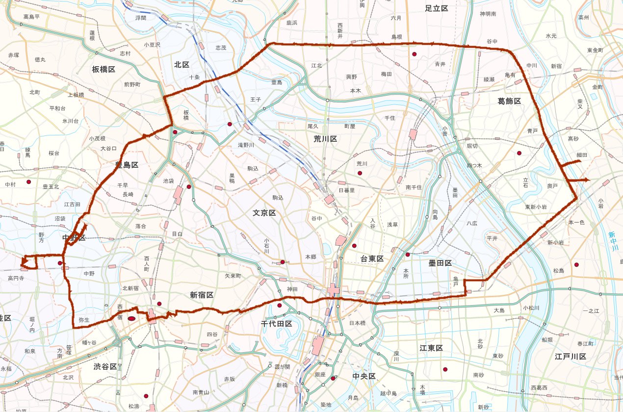 ほんとは一周する予定だったんですが、環七は思いのほか自転車を押さないと通過できない箇所が多く、さらには渋滞のおかげで思いのほか時間を食い、夜は飲み会だったのもあって半周で切り上げちゃいました。汗